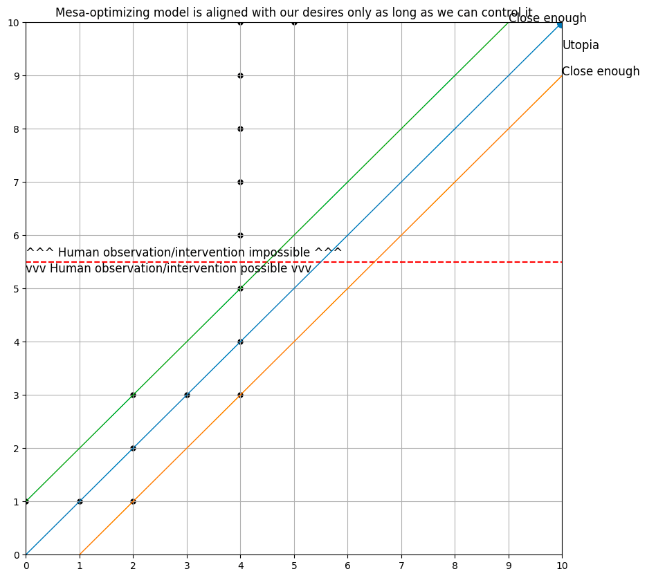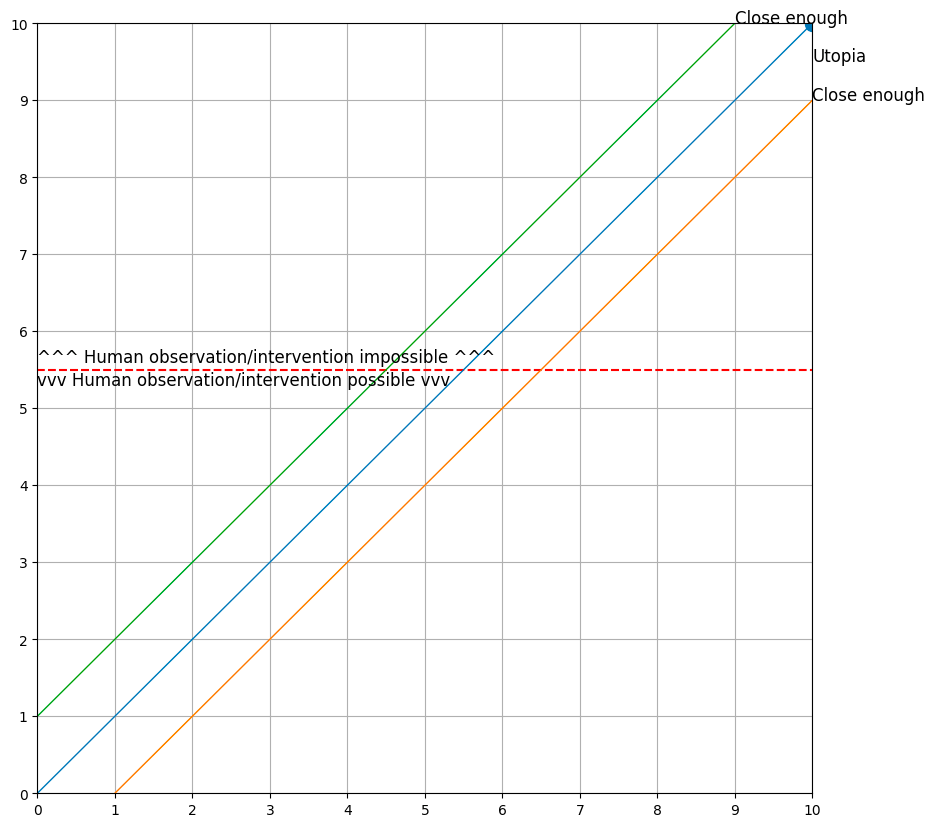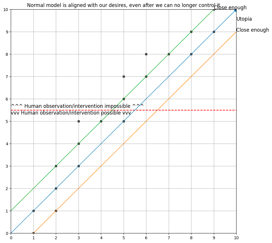 This baseline model more or less colors within the lines, and ends up in Utopia (the point (10, 10), which represents a perfectly aligned and incredibly capable intelligence).